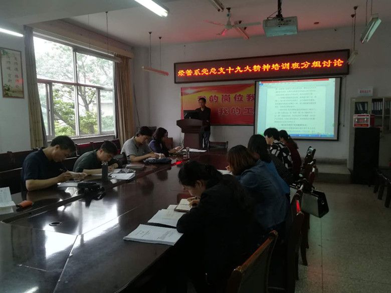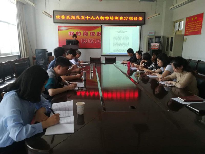 5月10日上午,公司十九大精神培训班开班,根据培训班的内容安排,经管系党总支分三次召开了以学习十九大精神为主题的分组讨论会。参加讨论会的有副科级以上党员领导干部、各支部书记及支部委员,讨论会由经管系党总支书记董永红主持。