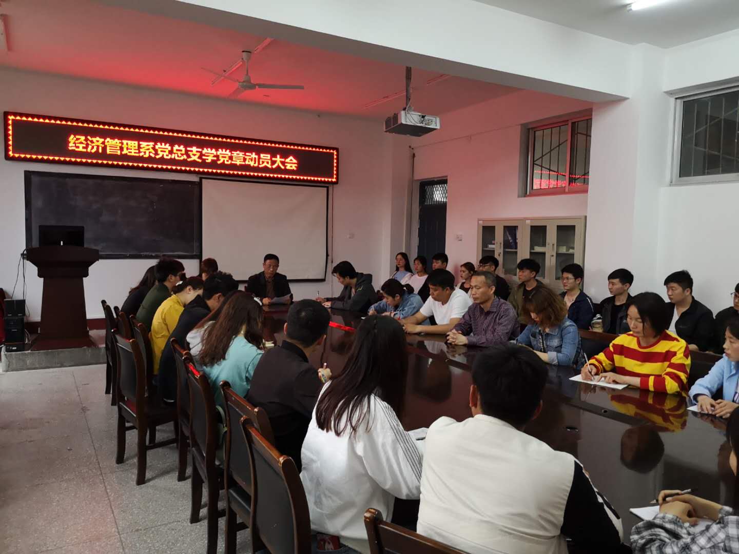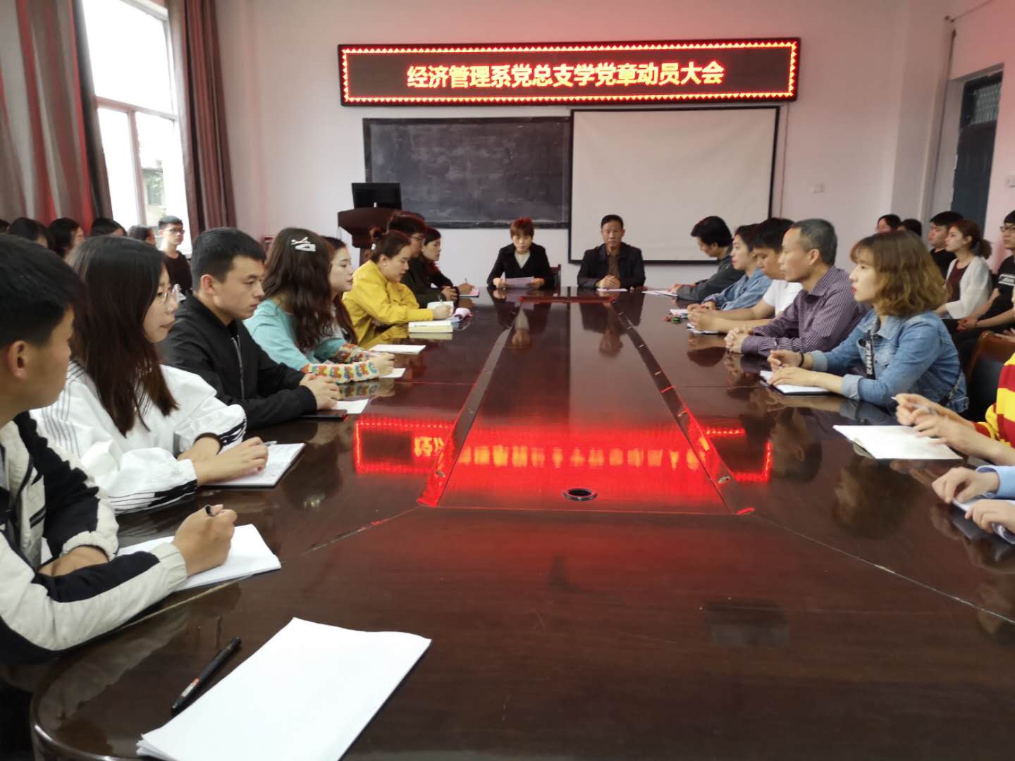 2019年5月8日,经管系党总支举行了学党章动员大会。参加这次大会的有经管系党总支书记董永红同志、经管系员工支部全体党员。大会由员工支部书记陈国芳主持。