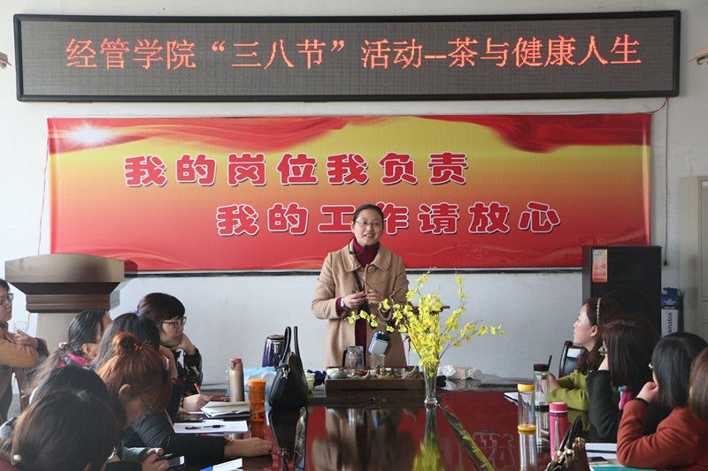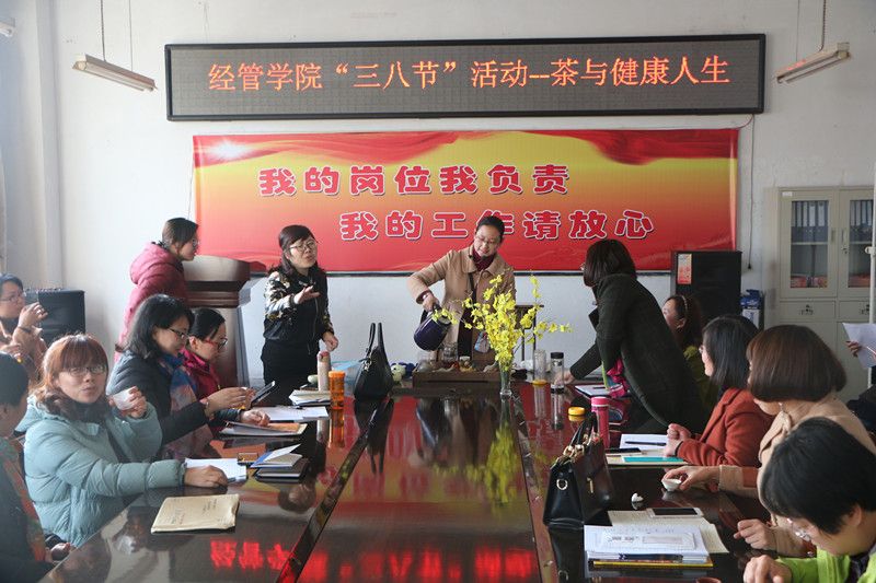 2017年3月6日下午,在“三八妇女节”来临之际,为营造出健康、和谐、积极向上的节日氛围,增进经管公司女教工之间的交流,进一步提升女教工爱岗敬业、乐于奉献的工作热情,经管公司在公司会议室开展了以“茶与健康人生”为主题的讲座活动。讲座由王晓艳老师主讲,并进行了现场的茶道演示,讲解了茶与健康人生的之间关系,一杯清茶,一种人生,豁达,开怀!细细品味,苦中有甜,清香四溢,健康人生的真缔!大家闻着淡淡地茶香,没有一点矫饰和浮躁,忘却了一切得失和荣辱,只有一份恬淡的心境。