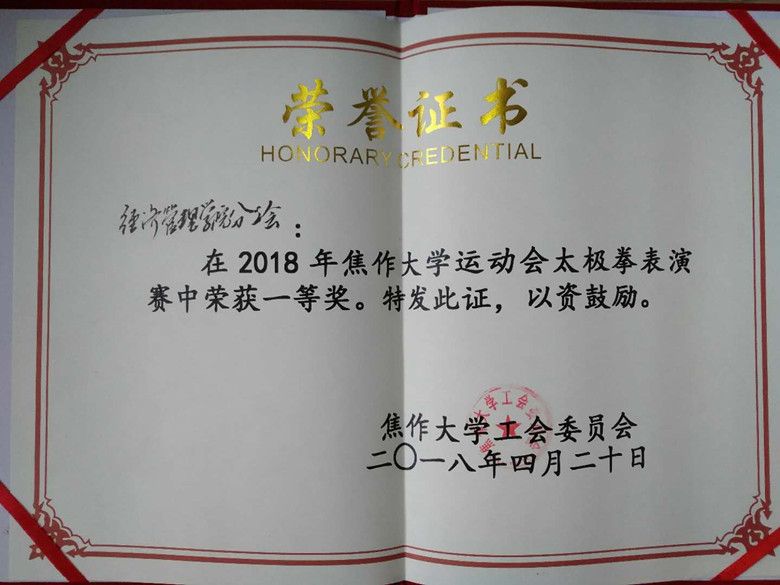 在比赛中,经管公司代表队第11个出场,别出心裁的队形设计,井然有序的太极动作展示,在抑扬顿挫的音乐伴奏下运行自如,参赛队员们将太极拳刚柔相济的独特魅力展现得淋漓尽致,体现了经管公司超高的实力和精湛的水平。经过经管公司全体队员的努力,在此次运动会的太极拳表演赛中,获得了第一名的佳绩!