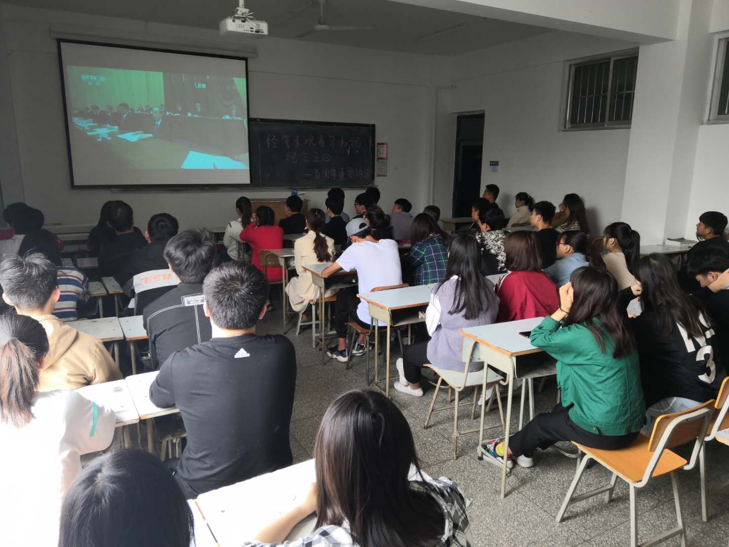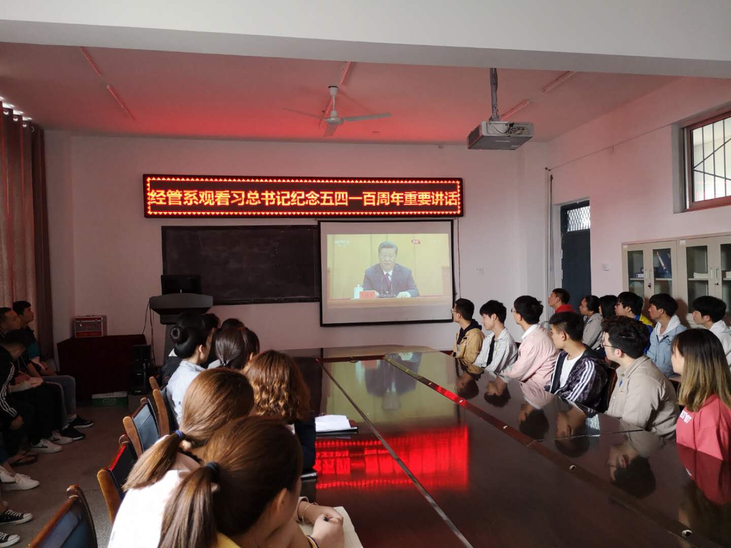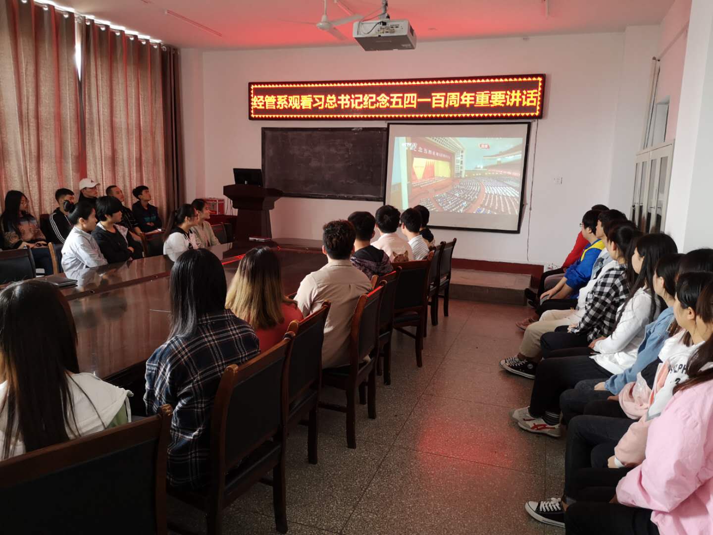 2019年4月30日上午,经管公司组织师生分别在会议室、教室观看了五四运动100周年大会,认真聆听了习总书记在大会上的重要讲话。