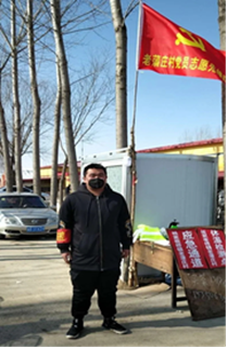 邢帅,yl6809永利18级市场营销3班班长,主动参加疫情防护工作,在防疫点进行执勤,并协助防疫工作人员给村里公共场合进行消毒,登记往来车辆与人员体温。