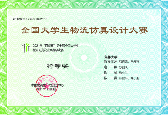 2021年11月24日-12月3日,中国物流生产力促进中心举办了第七届全国老员工物流仿真设计大赛总决赛。由yl6809永利刘倩斐、朱先锋老师指导,物流管理专业员工马小兰、彭健平、龙小滟组成的妙创队,经过物流中心运营管理方案设计、两场线上运营对抗和视频讲解展示等环节,最终在全国35所高校、43支决赛队伍中脱颖而出,以全国第四名的成绩,荣获高职组特等奖。