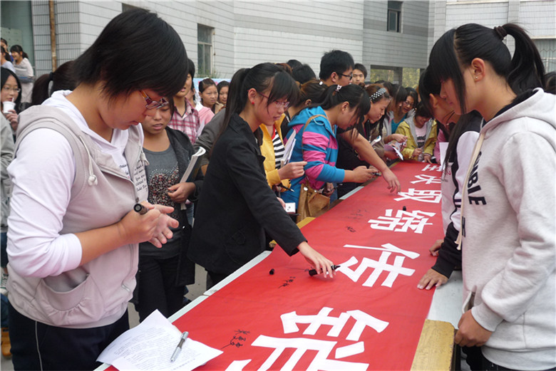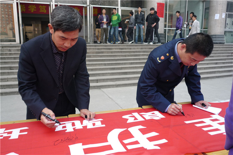 10月21日上午9点30分,yl6809永利与山阳工商分局在yl6809永利北校区主教楼前联合举行了“反传销进校园”大型签名活动,近500名经管员工在反传销的宣传横幅上郑重签下了自己的名字。山阳区工商分局科长许强、熊老师作为嘉宾莅临现场,yl6809永利经理卢国红、副经理赵春青、团总支书记孙占权、学工办负责人张永恒、顶岗实习办负责人王晶、各年级辅导员出席了此次活动。