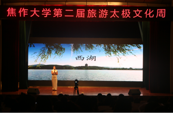 旅游与酒店管理教研室的卢静老师以别出心裁又兼具专业特色的开篇词揭开了整个汇报演出的序幕,旅游管理专业辅导员李雅冰老师行云流水般的古筝表演带领观众进入了如诗如画、天人合一的太极意境。18级旅游管理专业的肖卓同学、19级旅游管理专业的刘旭东同学、胡雪同学、周霖同学带领观众游览了“山盟虽在,锦书难托”的沈园,“朱墙黄瓦,雕栏画栋”的故宫,“水光潋滟,山色空蒙”的西湖,“武术之源,太极圣地”的陈家沟,使人不禁徜徉于浩瀚的历史文化长河,流连于奇妙的自然山水画卷之中。旅游与酒店管理教研室张利芹、姜红燕、王晓艳老师的《美哉,山阳;状哉,怀川》的讲解,为整个讲解环节画上了完美的句号,亦将整个展示推向了一个小高潮。