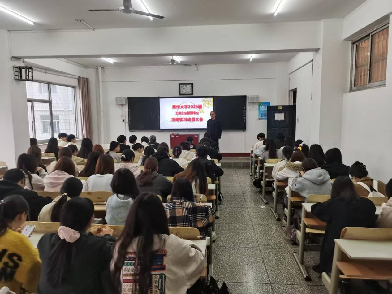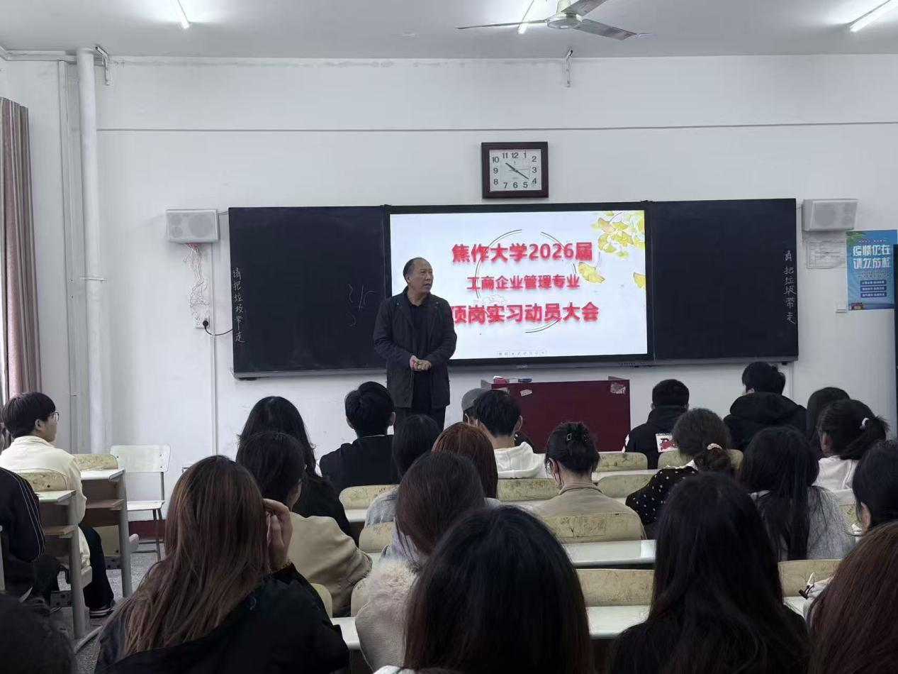 2025年10月17日上午,2026届工商企业管理专业毕业生在1号教学楼303教室(北校区)隆重举行了顶岗实习动员大会。此次大会旨在为即将踏上实习征程的学子们统一思想、明确目标和鼓舞士气,这不仅是实习前的必要程序,还是深刻的人生导航课和职业教育课,更是同学们从校园走向社会的关键转折点。公司副经理李有良、公司实训中心主任刘倩斐、工商企业管理教研室主任刘坤、毕业班辅导员彭彬以及2026届工商企业管理专业毕业生参会。