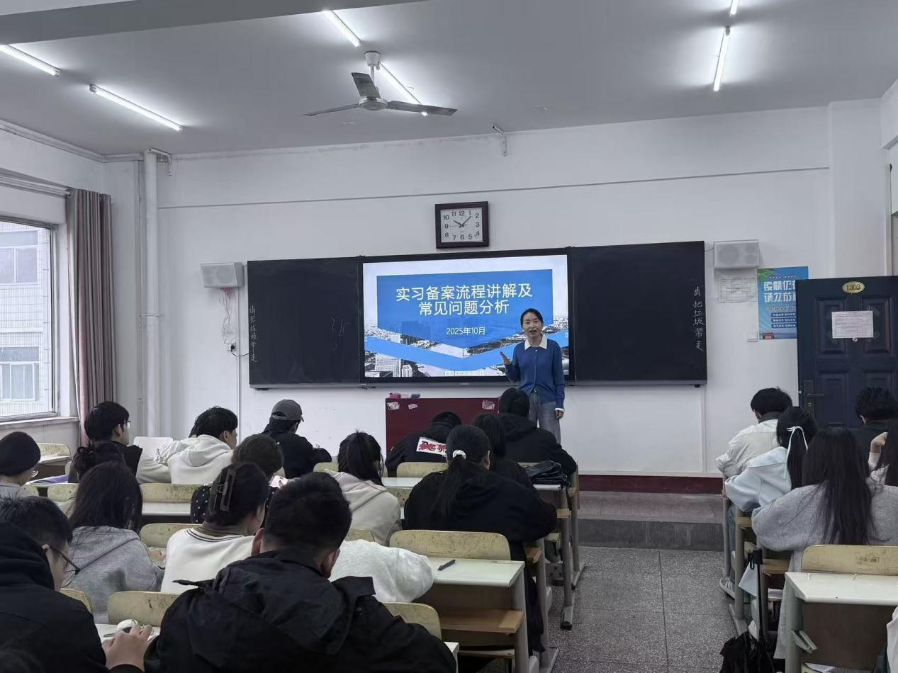 其次,公司实训中心主任刘倩斐详细介绍了河南省职业院校实习备案平台的具体操作和顶岗材料收集的具体要求。认真细致的展示了实习备案平台的各项功能,具体说明了材料收集的常见问题和注意事项,使得同学们对实习备案流程认识更加清晰,为即将到来的实习工作奠定了坚实的基础。