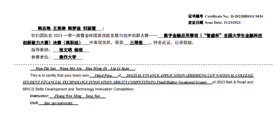 2023年11月25日,2023一带一路暨金砖国家技能发展与技术创新大赛数字金融应用赛项(高职组)全国总决赛圆满结束。在本次大赛中,公司教师张文明、杨琰指导的4名参赛选手韩志艳、王美琳、韩梦迪、刘丽媛荣获国赛三等奖。