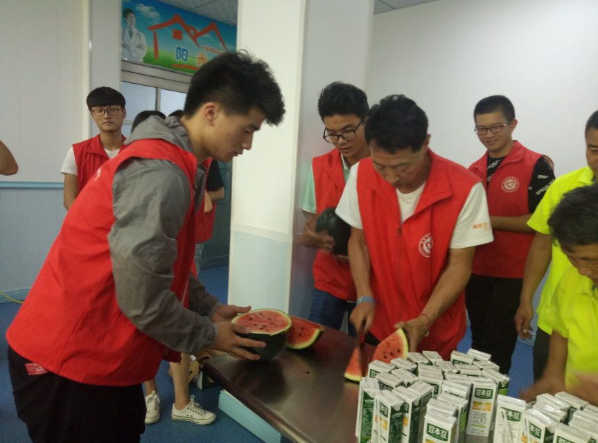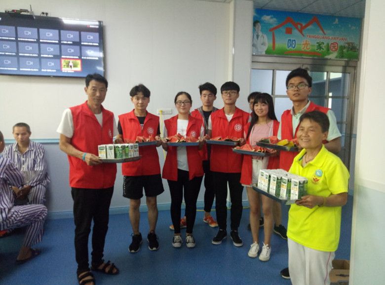 在活动期间,志愿者们给患者们送去了水果和豆奶,慰问了那些精神患者。大家都理解和尊重他们,并努力地和他们进行交流。因为他们是大脑活动功能失调而出现的认识、情感、意志和行为等方面的异常。所以对患者既要看到他们病态心理活动的一面,又要看到他们正常心理活动的一面。病人的很多言行、要求、想法都是合理的,志愿者们都尽可能的满足和解决患者的要求。