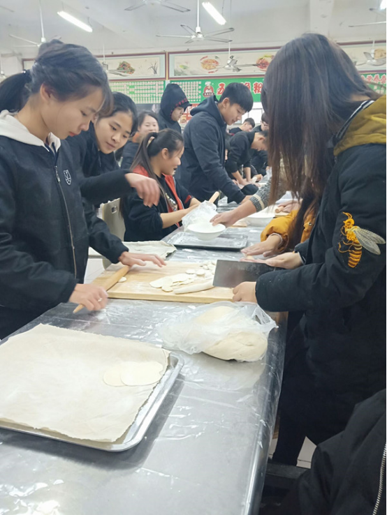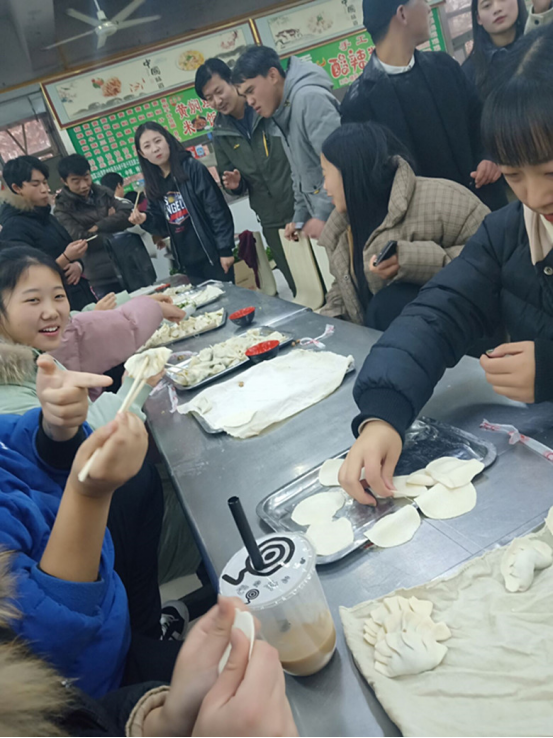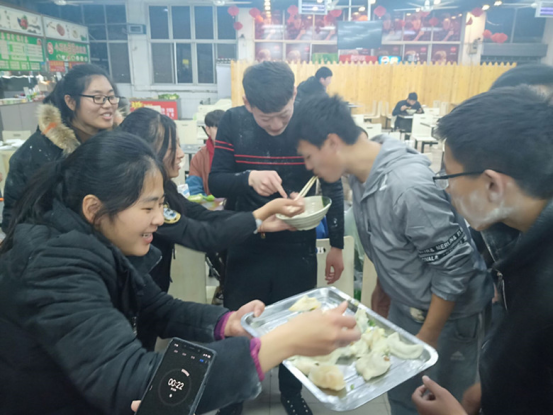 活动过程中同学们围在一起包饺子,尽管气温很低,包饺子的材料很冰,手很冷,但是同学们还是克服重重阻碍,乐在其中。当一盘盘的热饺上桌的时候,尽管它的外形可能并不算漂亮,味道并不算顶尖的,但是,当看到它的时候,洋溢在我们心里的是满满的满足。期间我们还举办了擀面皮、包饺子、吃饺子比赛,同学们都积极参与,比赛胜利者还获得奖品,虽然奖品不多,但意义深厚,同学们也都很开心。