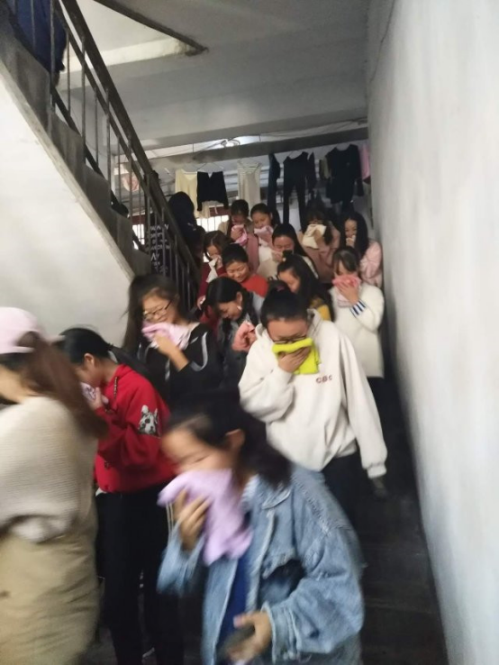 举行这次火灾应急疏散演练的主旨是让同学们在发生火灾时懂得最基本的逃生知识,能够懂得如何有序迅速到达安全的地方。在演练中同学们听到警报后,用湿毛巾捂好口鼻并井然有序地下楼,到达宿舍楼前“安全区域”并按照班级排好队伍。随后,学工办主任陈国芳为同学们讲解火灾应急安全知识,并告诉同学们逃生时需要用毛巾捂好口鼻以及为什么要捂好口鼻和弯下腰逃生。在此期间,同学们都认真的听取老师传授的安全知识,都很认真地对待这次演练。