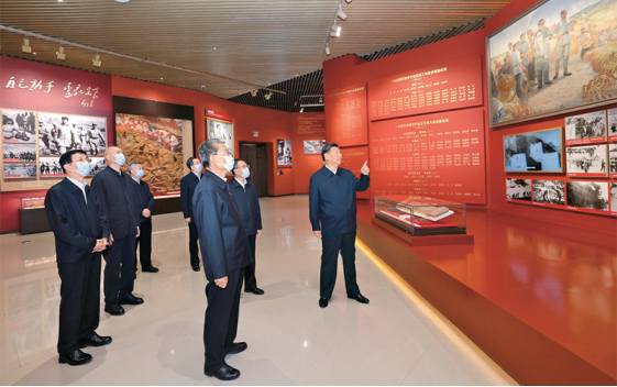 2022年10月27日,中共中央总书记、国家主席、中央军委主席习近平带领中共中央政治局常委李强、赵乐际、王沪宁、蔡奇、丁薛祥、李希,瞻仰延安革命纪念地。这是习近平等在延安革命纪念馆,参观《伟大历程——中共中央在延安十三年历史陈列》。 新华社记者 鞠鹏/摄